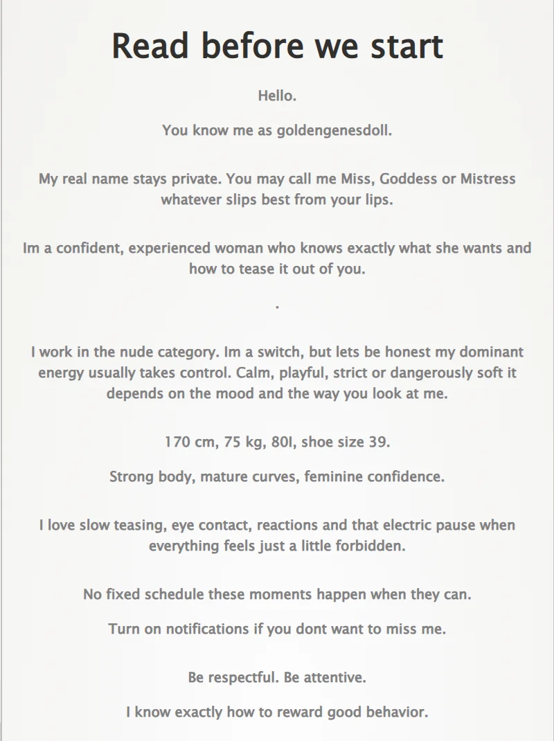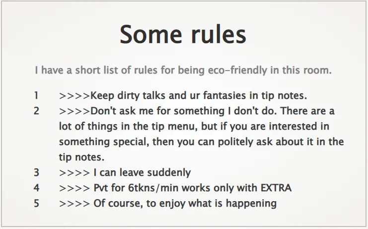 Camel Toe, Amante, Nylon, Twerk, Plesnire, Joc de rol, Discutii murdare, Handjob, Flashing, Yoga, Pantofi cu toc, Masaj, Masturbare cu degetele, Sex între sâni, Evaluare Penisuri, Umilire, Dans Erotic, Striptease, Jucarii Sexuale, Pe la spate, Cowgirl, Masturbare, Instrucțiuni pentru masturbare, Hardcore, Felație, Topless, Fetis Picioare, Footjob, Orgasm